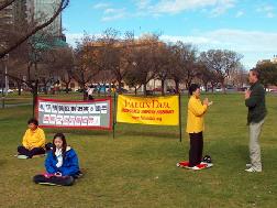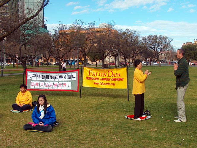 在银行工作的Wendy告诉记者修炼法轮功使她身心受益,她说:“修炼后我不但身体健康了,而且性格开朗,头脑清晰,做事事半功倍,每天都很愉快。我看每个人都是那么可爱,我的同事们也受到我的乐观情绪的感染,从不会在我面前发生争执。”正说着,一位练过瑜伽的西人青年询问如何学炼法轮功,法轮功学员当场就教他炼了起来。Wendy说:“我们在南澳各社区活动中心和公共公园有十个免费教功点,任何人来学都受欢迎,教功点的具体资料可以每周六到中国城或维多利亚广场法轮功讲真象点来索取。”