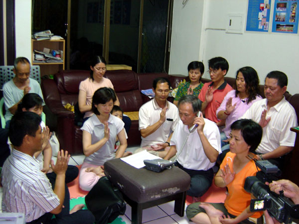 有一个年轻人明白真象后,坐了下来模仿其他学员,想做第五套功功法的炼功动作,他说:“我努力试着去做,我和你们同在。”