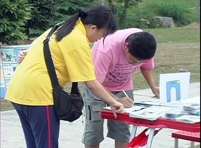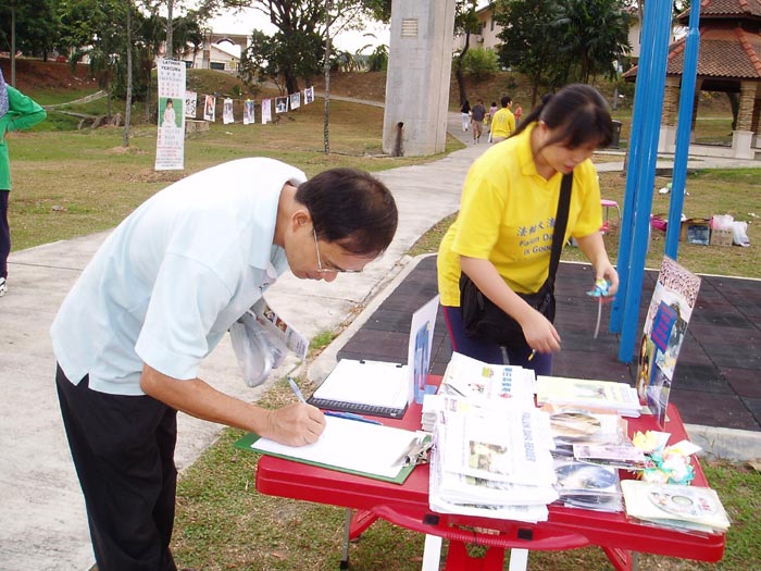 【明慧网2005年7月4日】近日来,马来西亚法轮功学员在几个不同的公园炼功点举行了反酷刑展活动,揭露中共对法轮功的残酷迫害。2005年7月3日(星期日)早上,反酷刑展在八打灵(Petaling Jaya)的Taman Sri Aman公园的炼功点举办。虽然当天公园里晨运人士不是非常多,但是,经过活动地点的人士大部份都很乐意接受资料及聆听学员们讲述发生在中国的迫害真象,尤其当提到最近发生的中国法轮功学员高蓉蓉被残酷迫害致死的骇人听闻事件,人们都不禁为之动容,过后都以实际行动签名支持反迫害。