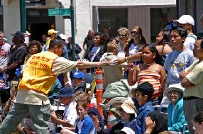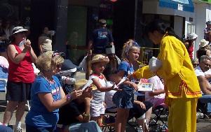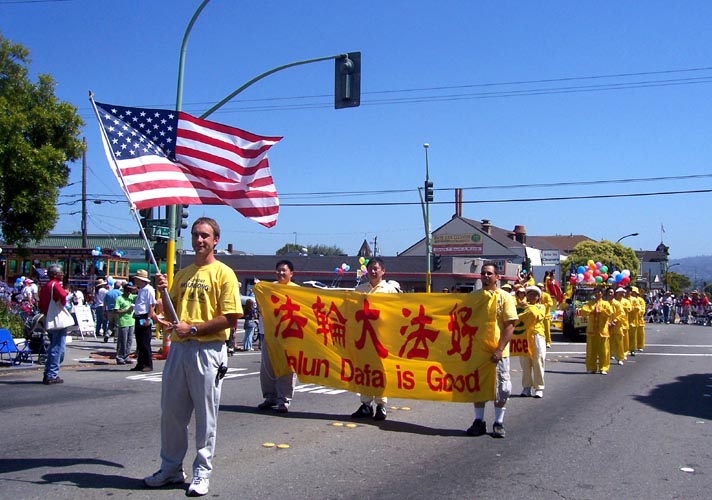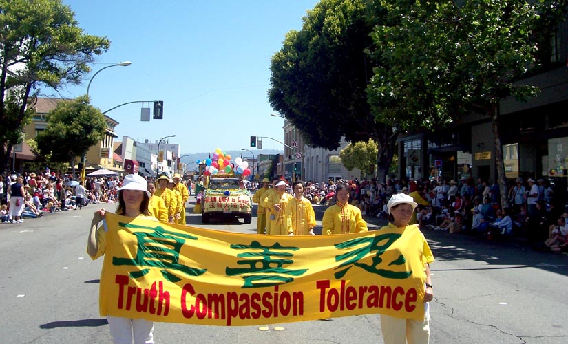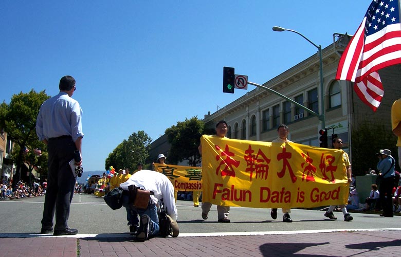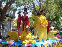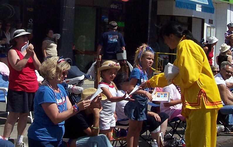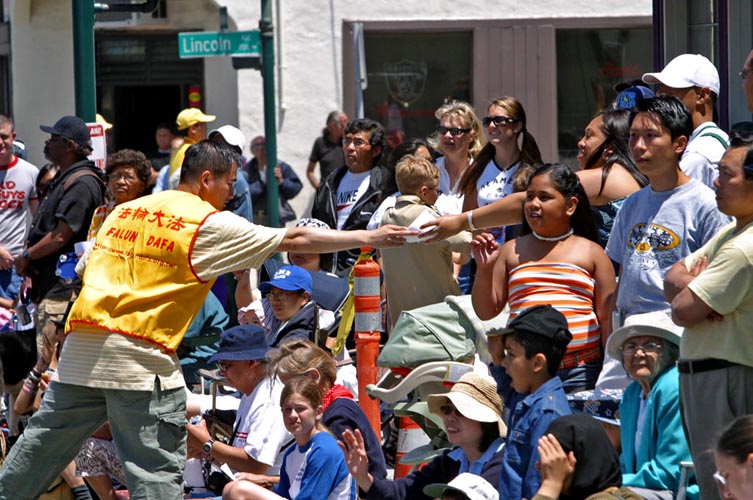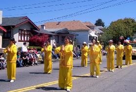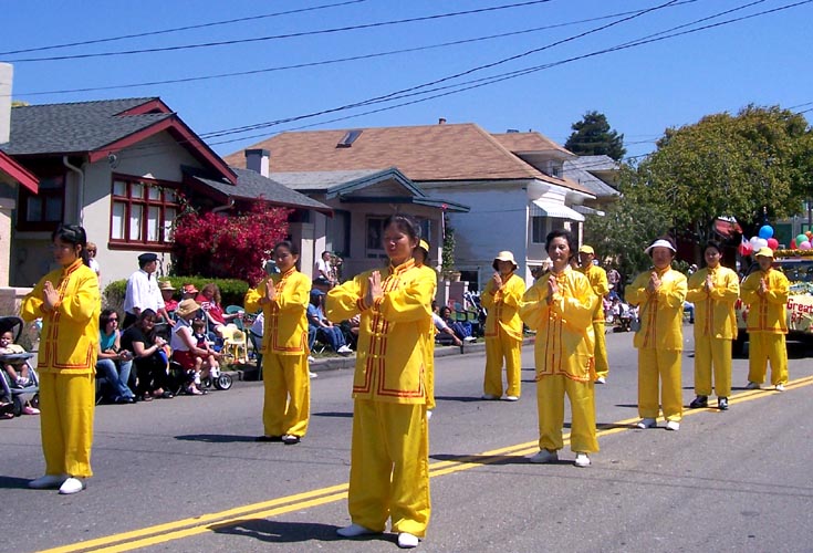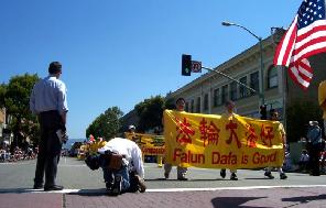队伍经过时,热情的民众有的鼓掌,有的向学员挥手致意,有的欢呼“法轮功!法轮功!”。