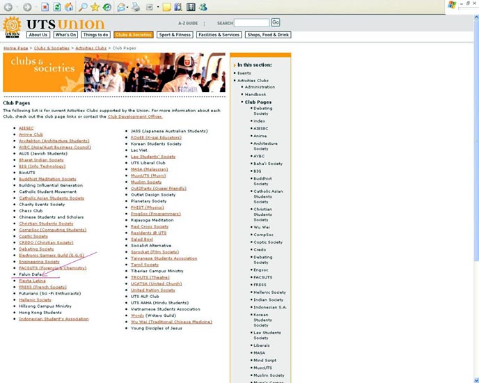 悉尼科技大学有着众多的学生团体,从文化、体育到打坐和宗教团体。法轮大法俱乐部是其中的一个学生团体,列在悉尼科技大学学生会网站上。该校的法轮大法俱乐部除了每周在校园进行免费教功之外,于今年四月间在该校学生会的大力支持下在学校成功举办了“真善忍”画展,向学校的众多师生员工展示了修炼法轮功的艺术家们的作品,展现了修炼法轮大法给他们带来的美好祥和以及在中国对法轮功的迫害中所用的一些折磨和酷刑手段。