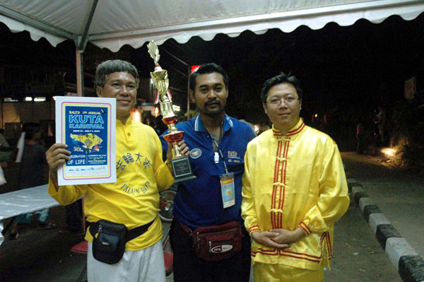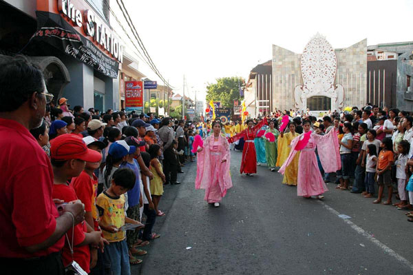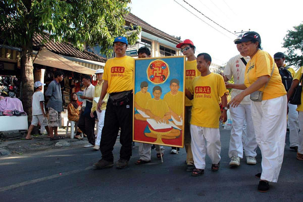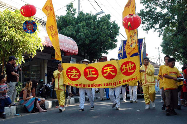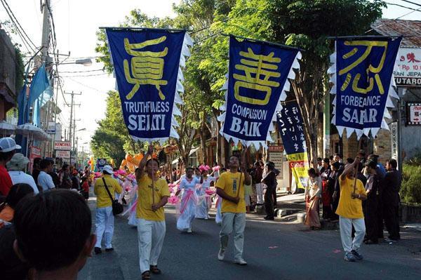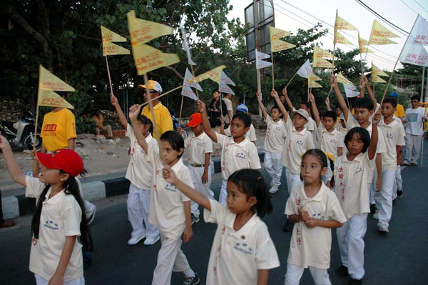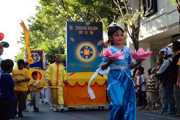 【明慧网2005年7月8日】印尼东部巴厘岛(Bali)选择7月的头一个星期来举办年届故德嘉年华会(Kuta Carnival),重振曾一度因爆炸案而陷入瘫痪的旅游业。今年嘉年华会的主题是“欢庆重生”,当天由芭彤(Badung)市长主持开幕,市县级官员和故德地区社会人士均踊跃出席。法轮功团体被评为最出色的队伍,荣获优异奖章和奖杯。