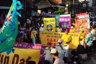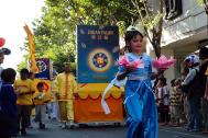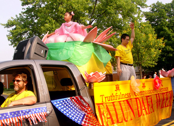 学员们布置了一辆花车,两名学员分别坐在两朵大莲花中央,演示第五套功法,一名学员演示动功。花车和拖车上点缀着大小不一的手折纸莲花。紧随花车之后的是写有真、善、忍的大横幅。