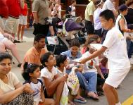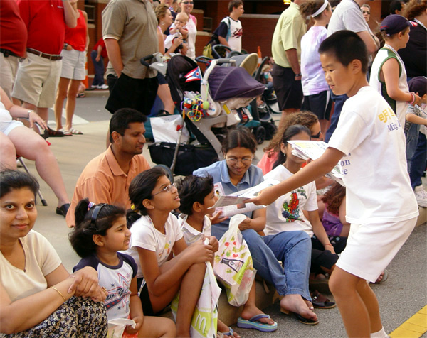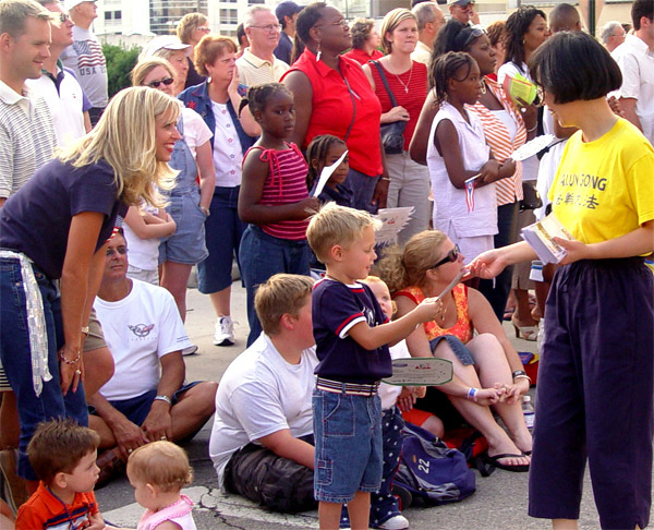 ![]() 哥伦布市游行中的法轮功腰鼓阵 | ![]() 小观众:“我也要一个(洪法书签)。” | ![]() 小弟子在发真象资料 |