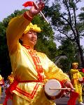 ![]() 腰鼓队 | ![]() 法轮功学员在花车上演示功法 | ![]() 旗队 |