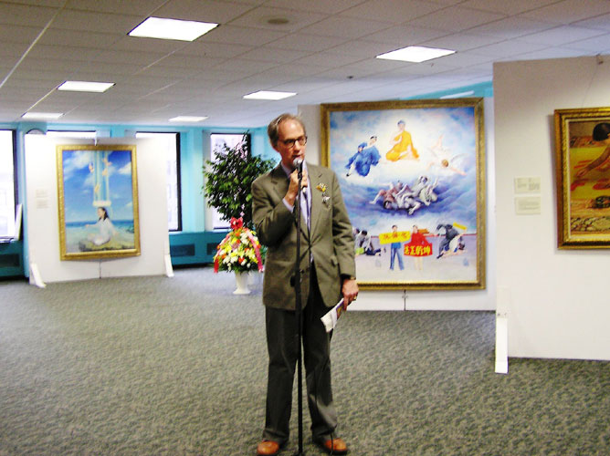 画家张昆仑教授和来自日本的李圆代表了画家们致词。张教授表达了对展出单位的感谢,指出所有的灵感都来自画家修炼的亲身体验和中国大陆发生的残酷迫害,绘画作品表达了艺术家们对神佛的敬仰和礼赞,亲身修炼所经历的美好境界,以及修炼人面对残酷迫害大善大忍坚忍不拔的精神。张教授提到自己在大陆四次被关押,被打,被电击,被洗脑的真实经历。画家李圆表达了作为法轮大法艺术中心的成员,他们希望重新找回古老的正统的绘画技术和绘画表达的内涵,希望赋予古老的艺术崭新的生命。