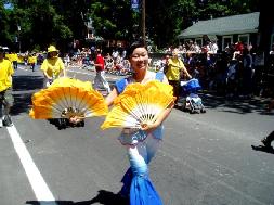 在长达2.5英里的游行路上,法轮功的游行队伍以美国特色的花车及中国传统文化的腰鼓队和仙女队为主。震天的腰鼓声和优美的扇子舞迎来了观众的鼓掌和喝彩。