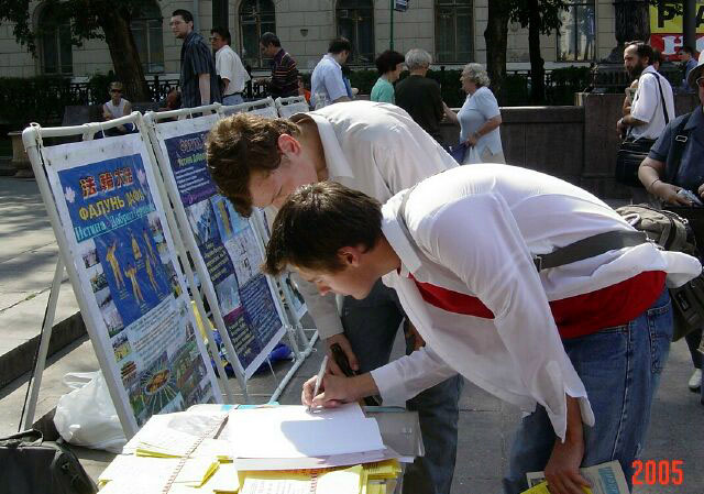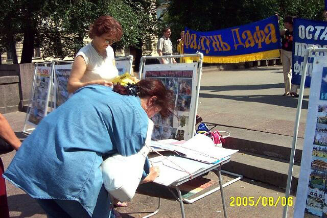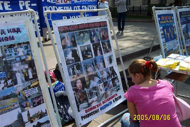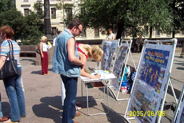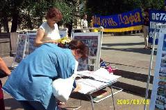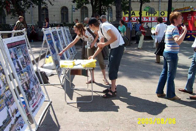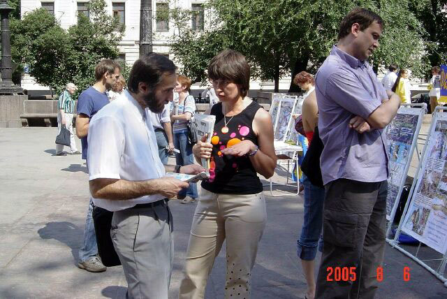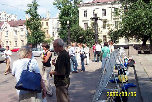 2005年8月6日,俄罗斯法轮功学员在莫斯科中心区讲真象,呼吁人们关注并帮助制止中共恶党对法轮功的残酷迫害。这场迫害已经持续六年多了,迫害的残酷和疯狂仍被中共极力掩盖着。几年来莫斯科法轮功学员,为了让世人了解迫害真象,肃清中共恶党通过其驻外使领馆和海外媒体散布的流毒,他们从一个社区到另一个社区的集中讲真象,深入到社区的街道、商店、地铁口,广发资料,使更多的市民了解到真象并发出正义呼声。