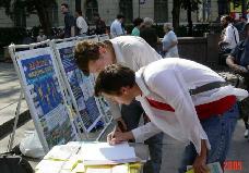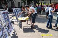 今天,学员们在市中心举行活动,展板和横幅还没完全准备好,有位官员模样的人便走过来,学员向他讲真象,他说:“我看到了,迫害太残酷了”,并首先签名支持反迫害。