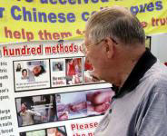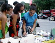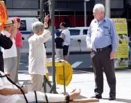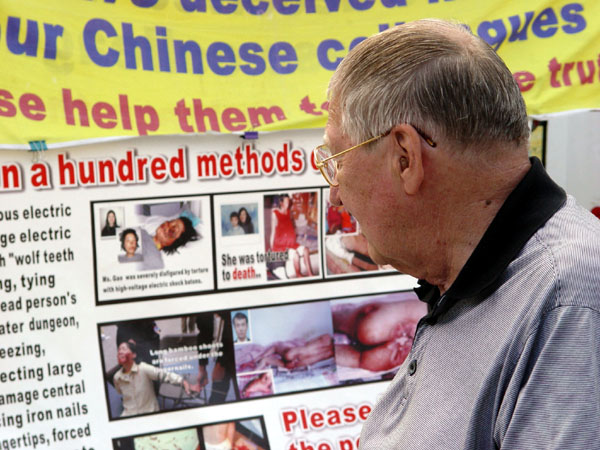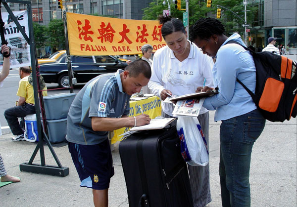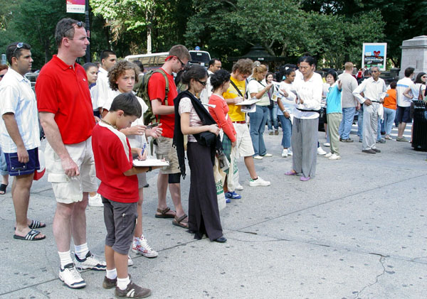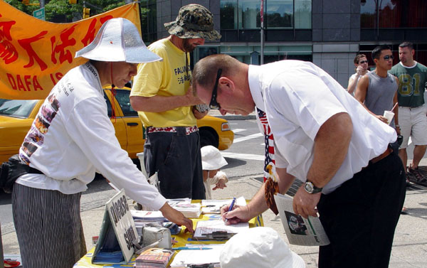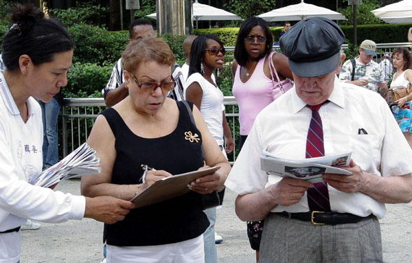 的真象。这里地理位置优越, 虽然当天气温高达华氏八~九十度,但经过的人群络绎不绝。人们为迫害真象所震惊,纷纷签名支持反迫害。