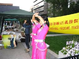 一位中年妇女与她的两个朋友也前来观看功法表演,这位妇女还向她的朋友讲述了她所了解的关于法轮功在中国遭到的迫害。