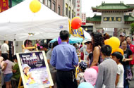 2005年8月7日,在波士顿中国城庆中秋活动中,法轮功学员的摊位以营救在中国大陆受迫害的法轮功学员的遗孤们为主题,学员们分守在各个路口,散发营救孤儿的传单;小弟子们也在发传单,折莲花;摊位前,人们纷纷踊跃签名支持营救。