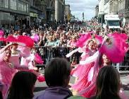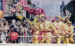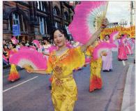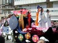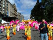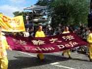 下午2点半,艺术节大游行正式开始。80多个团体,共三千多人参加,超过17万的市民和各国游客观看。法轮功学员的游行队伍由手持“真、善、忍”牌匾的三位学员领队,紧随着的是金色和紫色的“法轮大法”横幅,其后是舞龙队和舞狮队。然后是装点有法轮图形和朵朵莲花的花车,花车上两位学员和两个小弟子向人们展示着法轮功五套功法;另有三位学员装扮成佛、道、神的形象,向人们展示中华文明源远流长的修炼文化。花车后是随着“法轮大法好”音乐翩翩起舞的绸扇舞队和“法轮大法好”金色横幅。队伍中穿插着数面“世界需要真、善、忍”,“法轮大法使亿万人身心受益”和“法轮大法洪传世界六十多个国家”中英文字样的横幅。