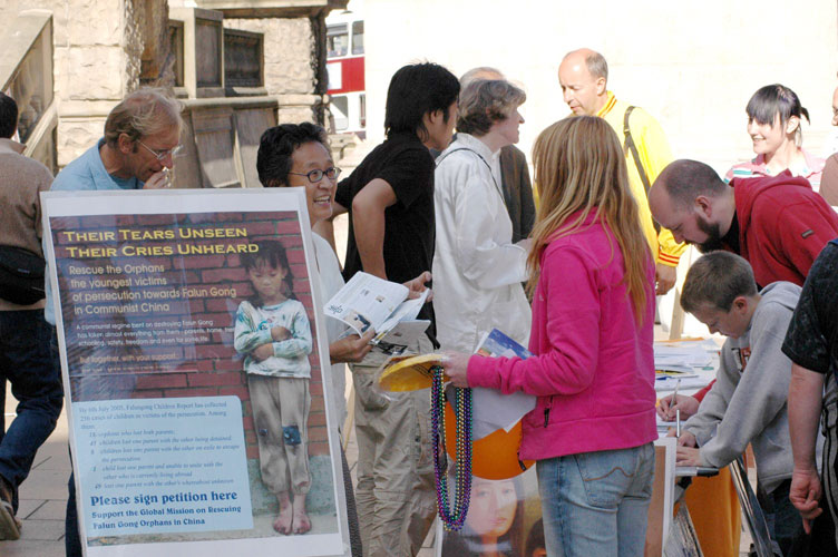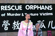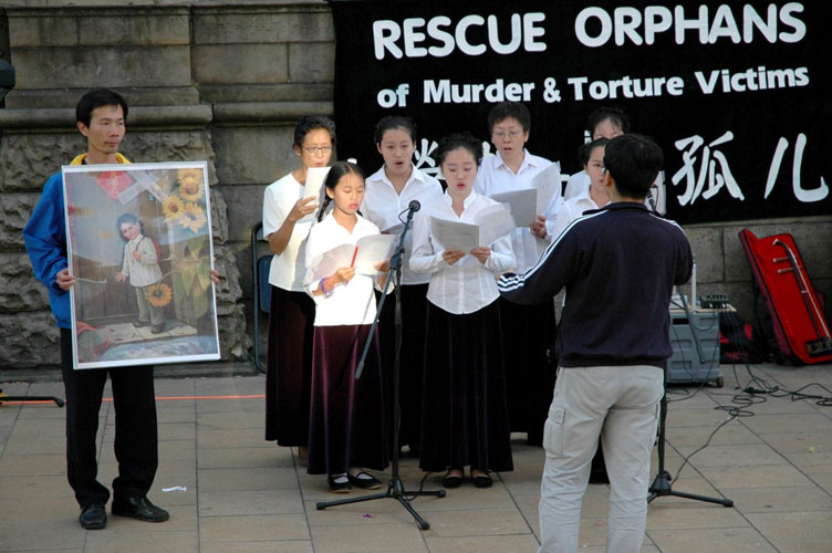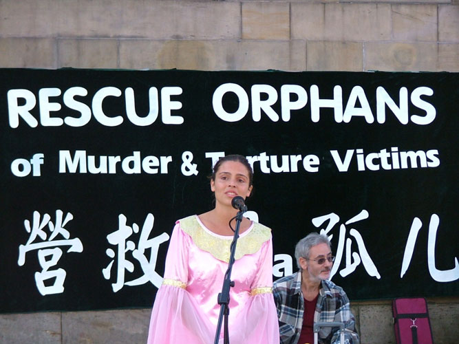 背景横幅十分醒目:“营救法轮功孤儿-在中国被迫害的法轮功学员的遗孤们”。演出场地旁边竖着的多幅展板讲述着这样的故事:放学回家,家门却被封,女孩无家可归(父母因修炼法轮功被警察抓走);父亲被迫害致死的女孩手擎爸爸的遗像说着:“我要爸爸”;和妈妈一起被关押的小男孩小手握着铁栏杆,满眼疑惑;流浪在街头的衣衫褴褛的赤脚小女孩……光是这些展板就足以动人心弦,观者无不面露同情之色。资料台上有对法轮功的介绍、揭露中共迫害法轮功的传单和光碟以及呼吁援助法轮功孤儿的征签表。音乐会还没开始,人们已经开始在征签表上签名了。