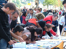 ![]() 女生小合唱把画中的故事声情并茂的展现给观众 | ![]() 在展板前了解法轮功真象 |
