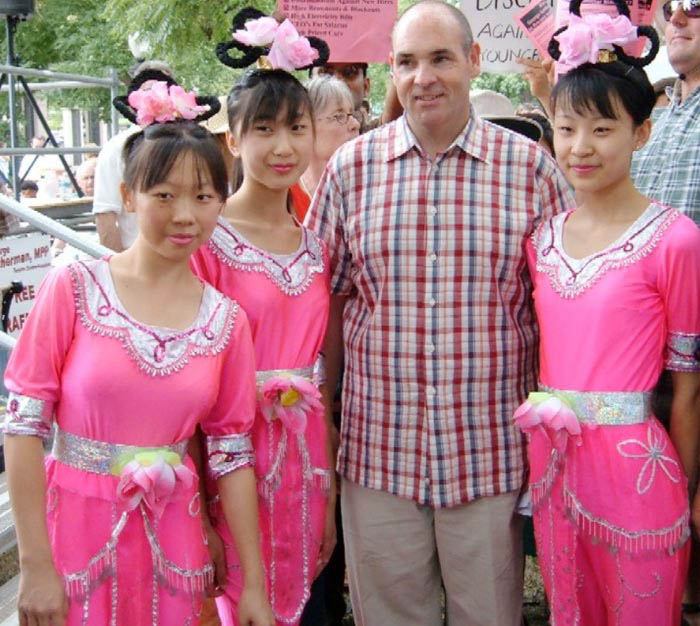法轮大法学员在临时搭建的舞台上,为观众表演了中国传统舞蹈和古筝,并演示了五套功法。台下也有学员在发真象资料。表演受到现场观众的热烈欢迎,有几位观众上前要求与学员合影留念,卫生部长斯密特蒙也与表演舞蹈的学员合影。