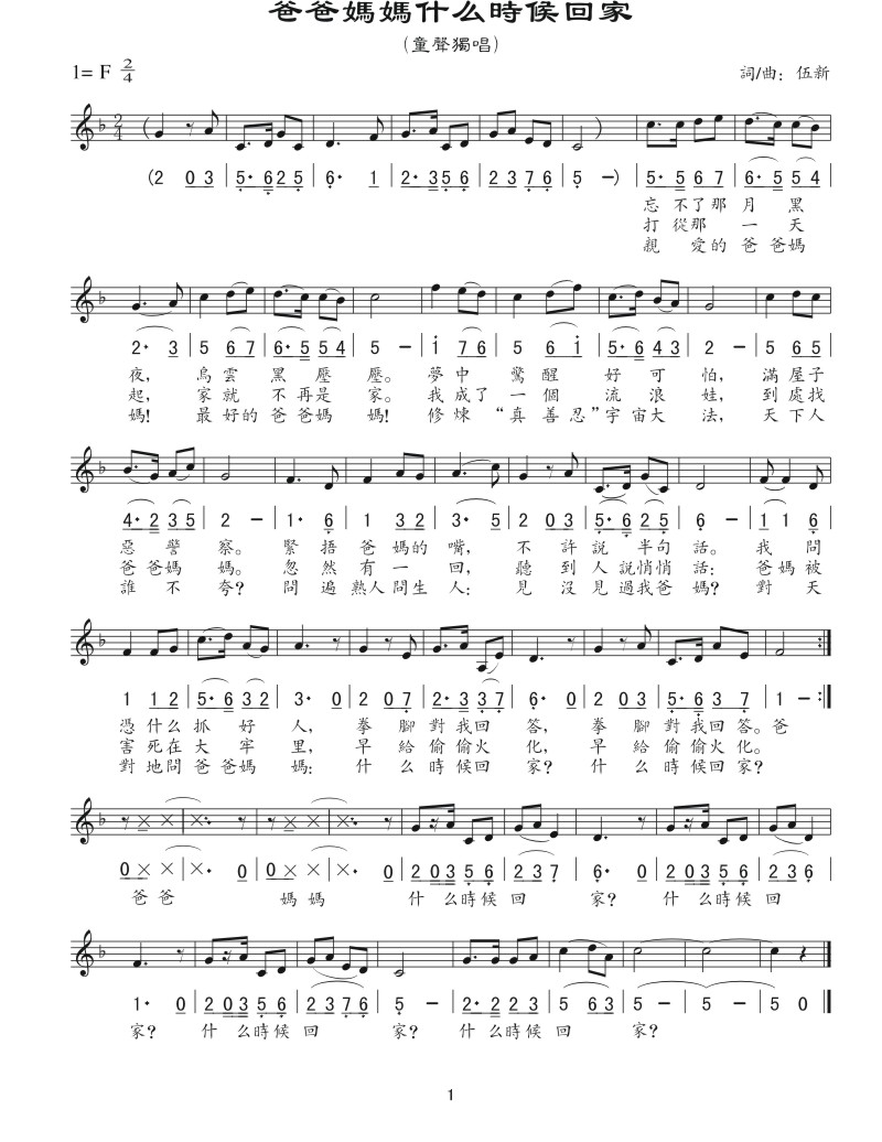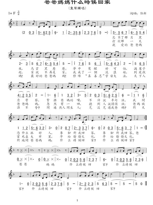 歌谱:爸爸妈妈什么时候回家(童声独唱)