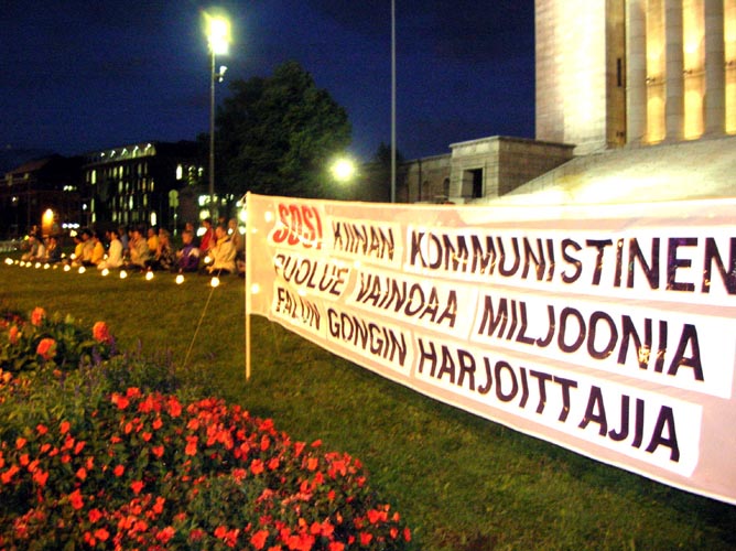 8月13日,世界田径锦标赛已近尾声。当夜幕降临,街上仍车水马龙之时,法轮功学员们在芬兰国会大厦前的人行道两侧挂起“法轮大法好”的横幅,摆放好揭露中共迫害法轮功的真象展板、部份被迫害致死的大陆同修的遗像,然后在大厦前的草坪上点起盏盏烛灯……