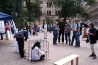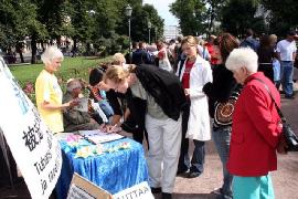 世锦赛期间赫尔辛基游人如织,热闹非凡,此公园内就设有五、六种表演。法轮功学员的展示场地位于公园中心,触目惊心的模拟酷刑演示和祥和的功法表演吸引了大批游客驻足观看。