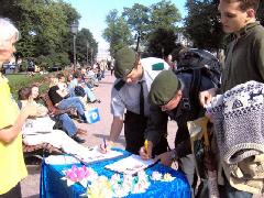 ![]() 这位过路的女士坐下来和学员们一起悼念死难的大法弟子 |