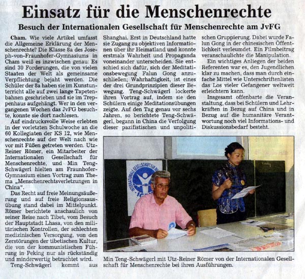 七月以来的两场中国人权报告会通过当地的报社——卡姆日报(Chamer Zeitung)和拜恩回响报(Bayerwald-Echo),还有约瑟夫·富奥恩霍夫高中的学校网站 https://www.jvfg-cham.de/jvfg/aktuelles/news/2005_07_22_29263645_meldung.php?navid=1