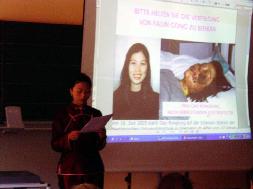 国际人权协会的瑞姆先生在开场白中,综述了人权在中国至今仍被严重践踏的事实。而后卡姆市法轮功学员敏滕-施为格(Min Teng-Schwägerl)作了简短的自我介绍,并道明来意,当即获得在座学生们的掌声欢迎和鼓励。接下来,瑞姆先生讲述了他在西藏冒着危险为西藏医院送药的亲身经历和所见所感,使在场师生认识到中共非人性的本质。