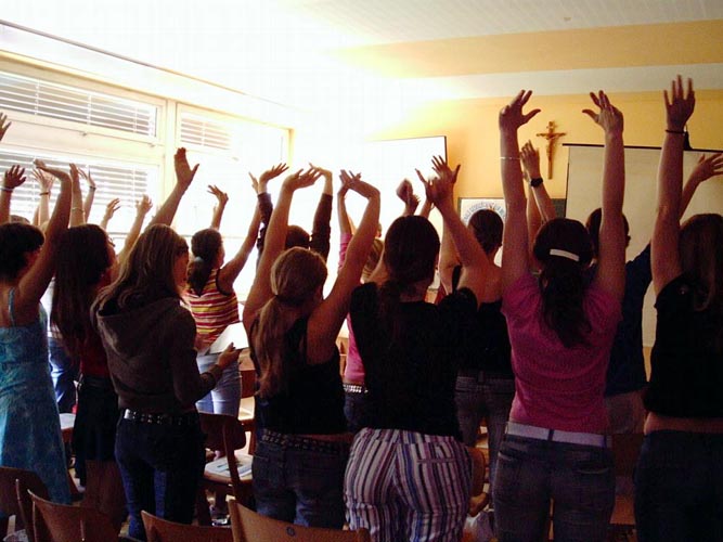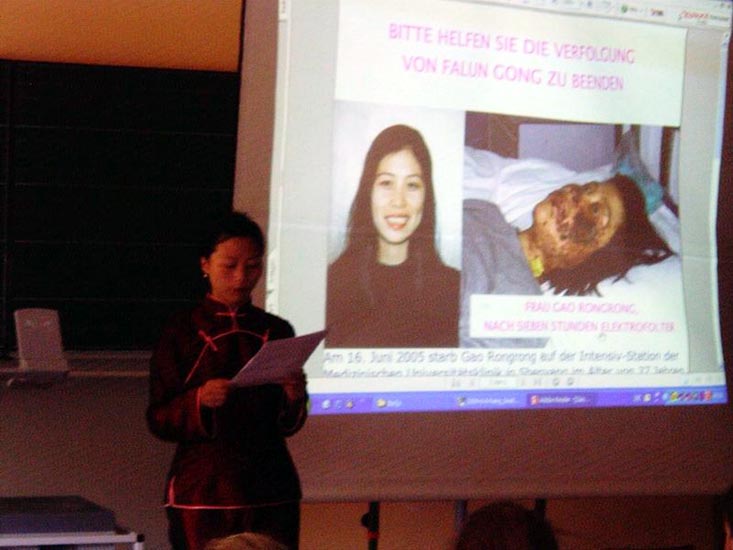 报告会的中间,法轮功学员播放了天安门自焚真象影片,揭露中共诬蔑法轮功的欺世谎言。之后,法轮功学员向大家展示了祥和的法轮功第五套功法-神通加持法。顿时,报告会现场的气氛被带入了一种宁静祥和的境界。在同学们试着学炼了简易的第三套功法之后,大家静静的听学员讲述法轮功学员在中国的遭遇,同时了解到,他们的签名救援可能意味着法轮功学员免遭酷刑折磨。比如被营救回德国的法轮功学员熊伟,就曾在卡姆的市府大厅陈述:她在监狱里得到相对其他法轮功学员来说略为宽松的待遇,当时她就想到可能在大墙之外有营救她的呼声。