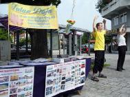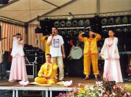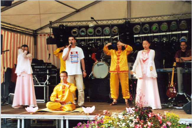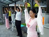 ![]() 法轮功学员的展台 | ![]() 炼功 | ![]() 舞台上的功法表演 |