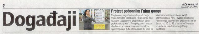 报道说,克罗地亚的法轮功学员活动中向人们分发传单,传单上披露了在中国的法轮功学员所遭受的残酷折磨。法轮功是一门古老的东方修炼法门,能纯净身心。