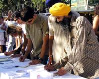 长长的签字桌前排着好几列长长的签字队伍,人们渴望着了解真象,人们也希望帮助结束迫害。望着这感人的场面,学员们不禁感到,正义的力量越来越强大,邪恶的迫害真的再也维持不下去了。