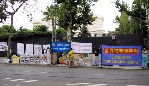 在中领馆前还遇到这样一件事:一对夫妇和他们的两个子女正要去赶赴一个朋友聚会,在中领馆前经过时看到了正在和平请愿的法轮功学员们,他们细细看了摆放在那里的一幅幅记录着中共残酷迫害人民的触目惊心的图片,震惊不已,他们停下来進一步向法轮功学员了解更多的真象后说:“谢谢你使我了解了这么多我过去从没有听说过的事情,我以前是另外的想法。今天对于我的生命是一个重大转折,因为我知道了‘真、善、忍’。”