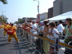法轮大法学员的队伍排在中间。他们有唐鼓、腰鼓、扇舞、山地舞及功法表演。鲜艳的“法轮大法好”横幅、洪亮的鼓声和学员翩翩的舞姿,给这次游行注入了清新感人的活力。