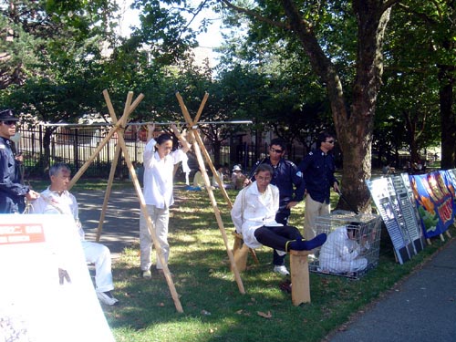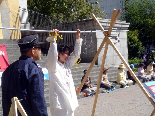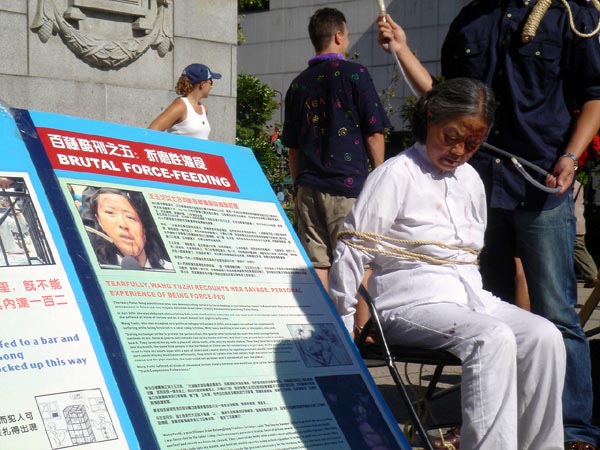 8月27、28日,温哥华法轮功学员再次在市中心艺术馆前举行反酷刑展,以真人模拟的方式向人们展示中国法轮功学员在中共暴政下,六年来所遭受的折磨,使加拿大人对迫害有一个感性的认识。