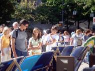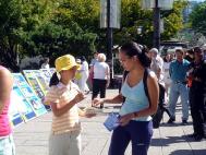 学员在回答人们关于中共为什么要迫害法轮功的同时,推介九评,告诉人们这是一篇非常精彩的有关中共历史的文章,有助于他们了解为什么中国现在还在发生着非人的迫害,为什么中共是目前全世界和平的最大威胁。