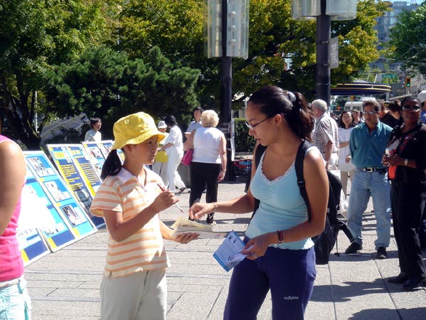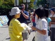 法轮功学员一边讲真象,一边向人们征签给加拿大总理马田的请愿信。签名信请求马丁在胡锦涛访加时,向其提出停止迫害法轮功的要求;同时,要求加拿大政府按照国际人权法和加拿大“反人类和战争罪”相关法律履行责任,拒绝向薄熙来和夏德仁发放签证。