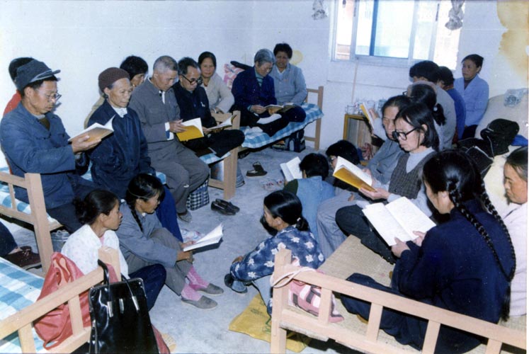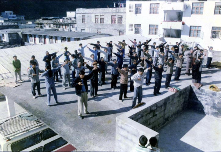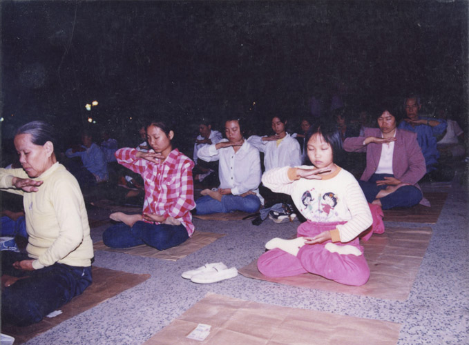 99年7.20以前,广西百色市学员在集体学法、炼功