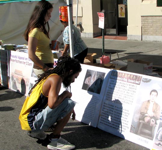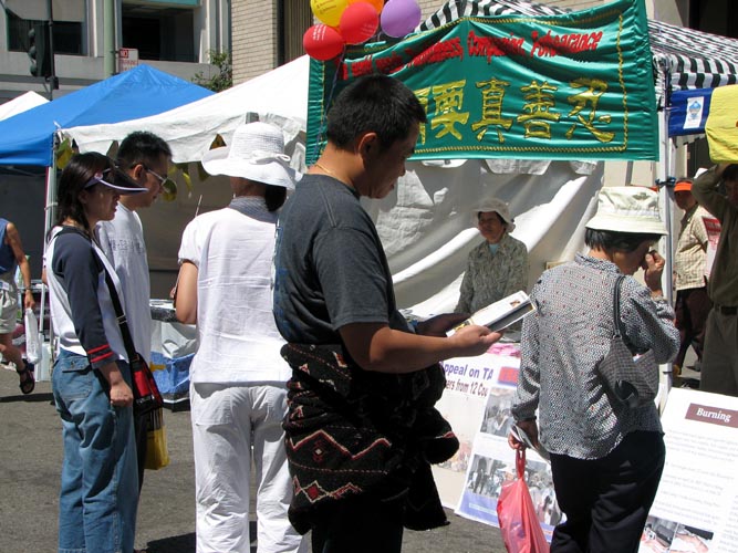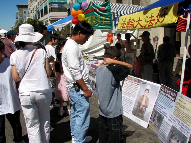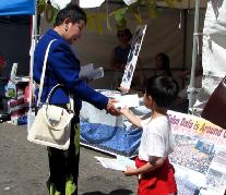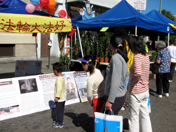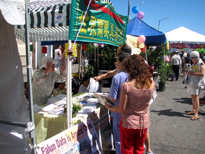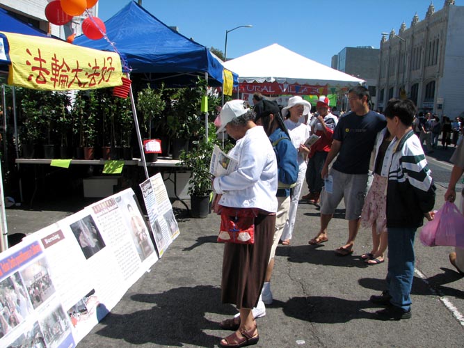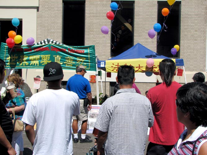 奥克兰是位于旧金山以东的一个大城市。据主办者统计,每年的街会都有至少20万人次参加,是北加州最大的街会之一。为了揭露中共对法轮功的残酷迫害,也让人们了解法轮功是一门很好的气功修炼,自2000年开始,法轮功学员每年都有在街会中摆放摊位;今年也不例外。很多人都表示听说过法轮功;也有的对现在还有这么严重的迫害发生而表示震惊;也有的表示想学功法。