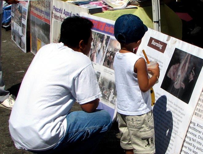一位来自秘鲁的男士仔细的观看酷刑展板上恶警正在用烟头烫被吊起来的法轮功学员。这位男士说,他以前是秘鲁的警察,他说中共的恶警太坏了。