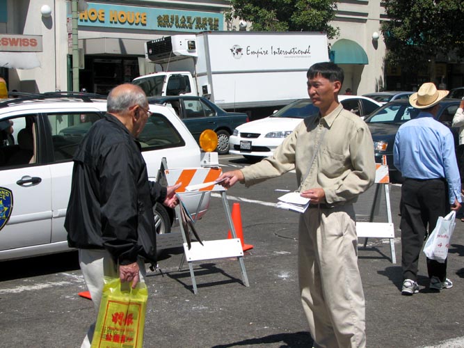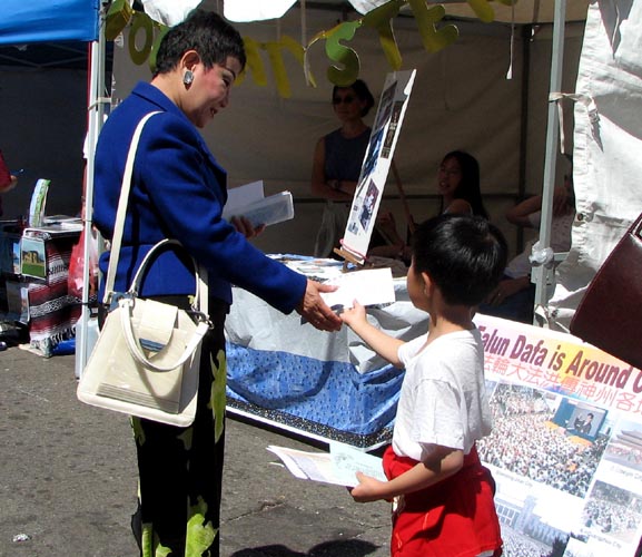 一位女士说她听说过法轮功,她在旧金山中领馆前见到学员在那里请愿,但她不明白为什么中共要迫害法轮功。学员告诉她,中国有上亿的人炼法轮功,当时的中共头目江××出于妒忌镇压法轮功,已经有将近3000名法轮功学员被迫害致死。她听后表示,希望法轮功能够最终获胜。
