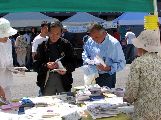有两位来自广东的老伯伯来到摊位,对学员说:“在中共的宣传下,目前还是有人误解法轮功;其实,每个人都不应偏听偏信;应该放开胸怀了解事实真象。你们做得很好,应该坚持,让更多人了解你们。”随后他们拿了各种真象资料才离去。