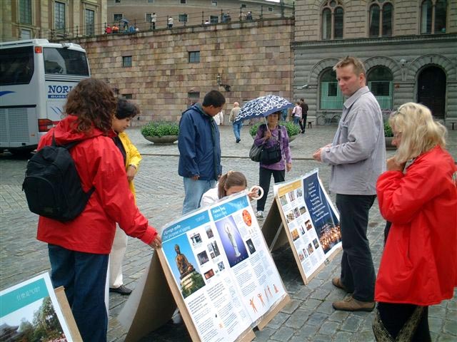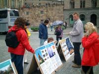 现场也准备了手工折的精美纸莲花发给小朋友们,他们接到后都表示非常感谢。学员们也发出英文、俄文、中文、德文和西班牙文等语种的法轮功真象小册子给许多游客。天空虽然飘着细雨,但是活动仍然继续着,一会儿之后,太阳就出来了。