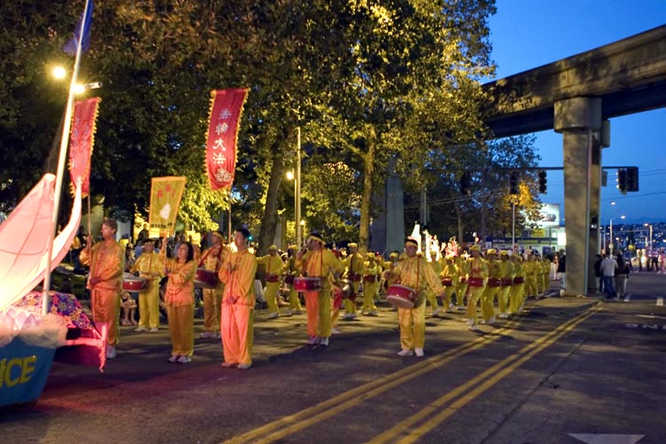 来自华盛顿州各地、俄勒冈州波特兰,和加拿大温哥华的部份法轮功学员参加了这次盛大游行。晚上约9点,在最后一丝夕阳中,法轮功学员们的队伍出发了。两位女学员打着“法轮大法”的横幅走在最前面,两头中国舞狮精神焕发、紧随其后。6位女学员身着粉色传统服装,手持灯光闪闪的莲花在音乐中翩翩起舞。随后的是天蓝色的“大法船”花车。“法船”高大无比,气势雄伟。上面英文大字“法轮大法”和大法网址金光闪闪。船的底部画着逼真的波浪,加上金色线条灯构成的波浪,就使得“大法船”的前行格外的显出乘风破浪的气势。船头后面的花车部份竖立起大船帆,上书“真善忍”和“法轮大法”的金色大字。花车上,大、小莲花里的学员和另一位年近80的老年学员面带微笑的展示静功,莲花叶上仙女打扮的女学员向观众频频招手。两位西人弟子炼着动功。这7位学员代表了修炼法轮大法的人群中囊括男女老少、华人、西人。金黄而柔和的灯光把花车上粉色的莲花烘托的格外美丽圣洁。