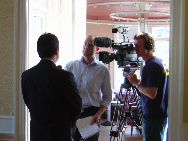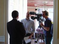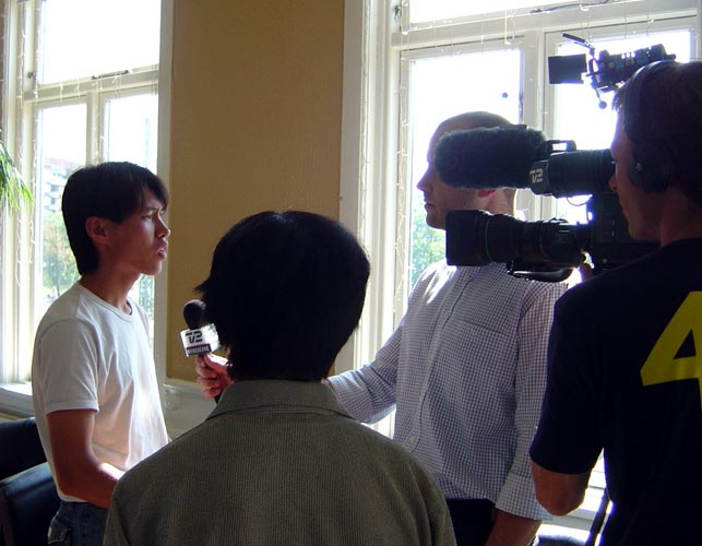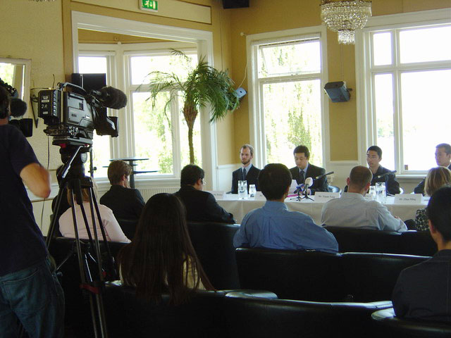 8月29日,丹麦法轮功学会召开新闻发布会,各大主流媒体到场采访。