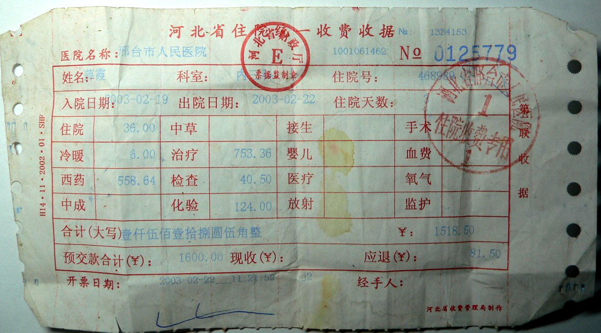 ![]() 薛霞的治疗医院收据 |