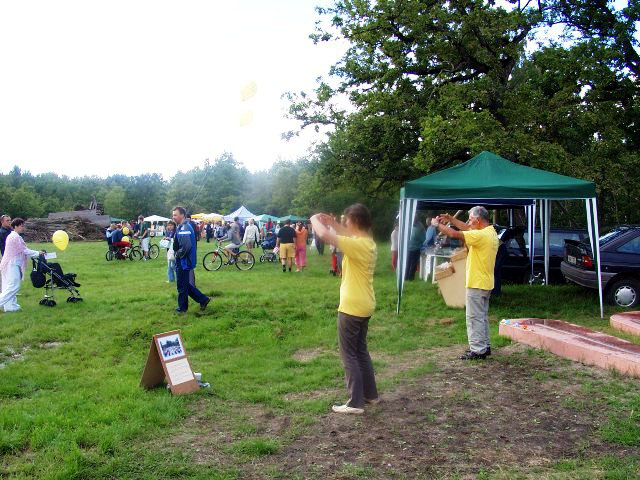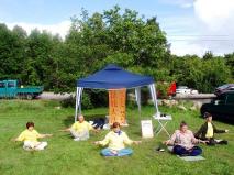 活动期间一度下起了雨,好多人为了避雨跑進了法轮功学员的帐篷,避雨之际他们还意外的获得了法轮功真象传单和学员们亲手折叠的纸莲花。