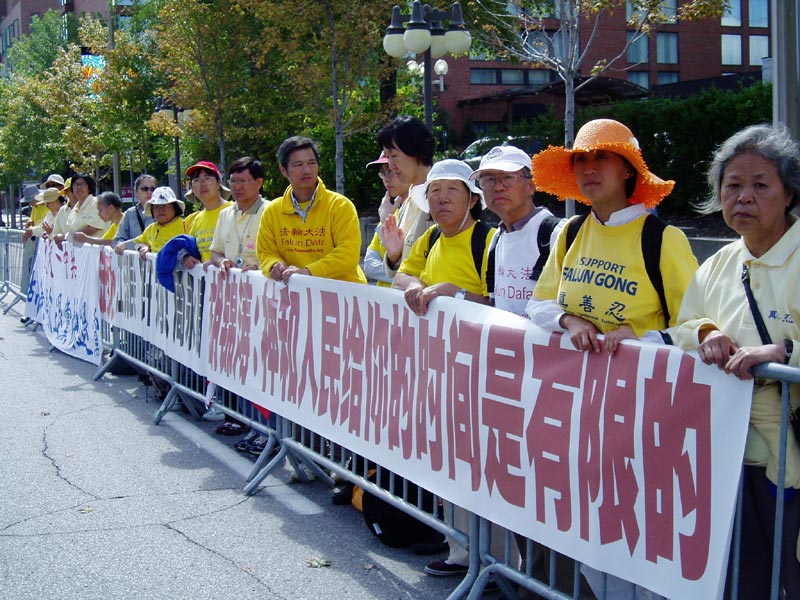 据美联社9月9日报导,9月9日星期五,胡锦涛继续在加拿大的访问,数百名法轮功学员在国会山外举行和平请愿。