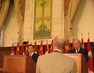 ![]() 图:9月9日上午11点20分,加拿大电视台资深记者罗杰史密斯在国际众多媒体面前,询问胡锦涛对国会山外展示受到迫害和酷刑折磨的法轮功学员、民运人士和知识份子的诉求有何回应。 |