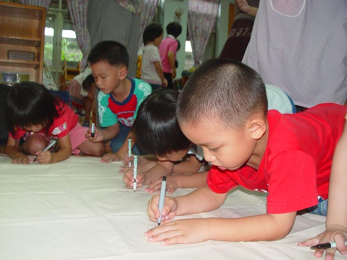 征签活动的第二站是弘育幼儿园,该园的小朋友大多学炼过法轮功,知道法轮功“真、善、忍”是好的,有一个小女生在看完影片后一直哭,直说为什么警察要打死她们?为什么要把她们关起来?她不明白?很多孩子更围着学员问,想不通为什么警察要抓他们,打他们?幼儿园许园长和老师们见状都忙着帮助讲真象,孩子们在听明白了真象后,都很认真的签名或在征签布条上作画,深怕美国总统布什不明白她们的心意。