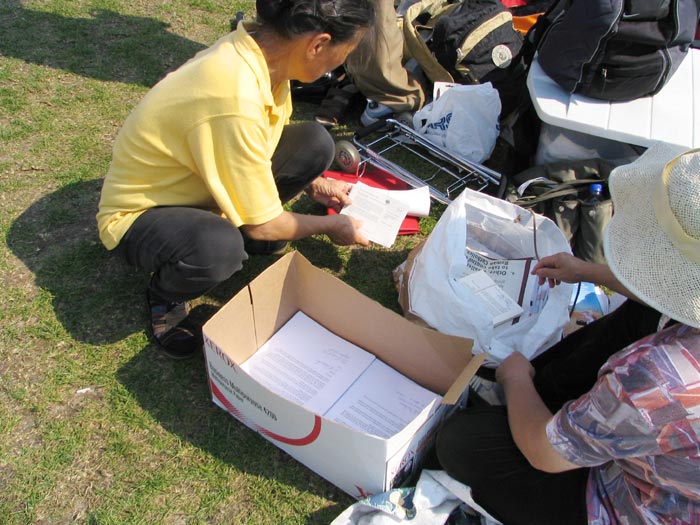 每天办完反酷刑展后,老阿姨都整理当天收集到的签名信