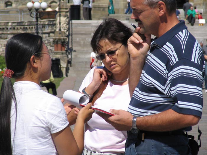 法轮功学员每天都在烈日下征集签名,签名的过程是一个讲真象的过程